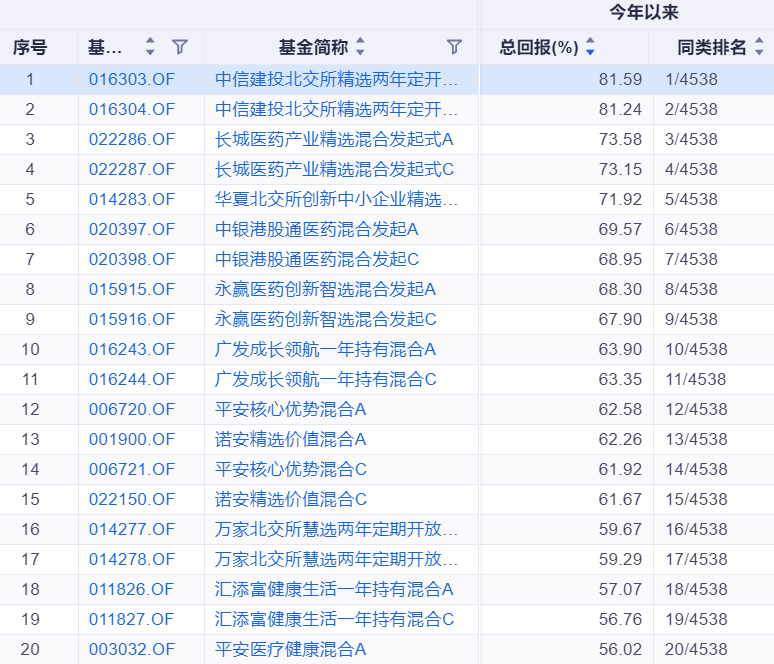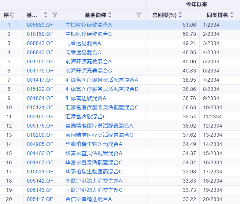 以位列第一的中银医疗保健混合A为例,该基金主要定位于医药器械研发、制造、销售与医疗服务行业上市公司的投资。其重仓股也是清一色的医药企业。