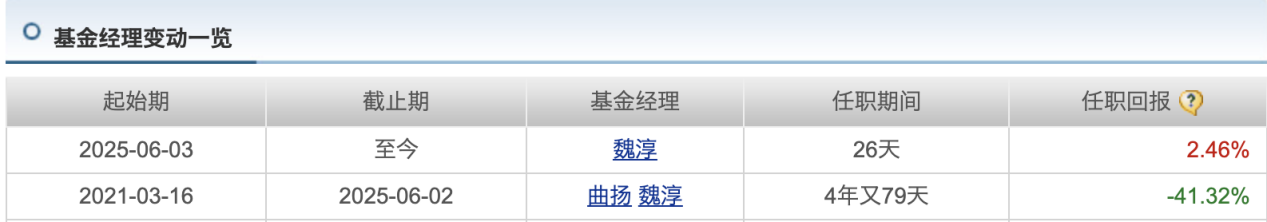 一个呢,过去几年,一直是曲扬和魏淳共同管理这只基金,魏单独管理只有不到一个月的时间。