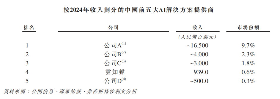 图/按2024年收入计算的中国前五大AI解决方案提供商 来源/云知声招股书