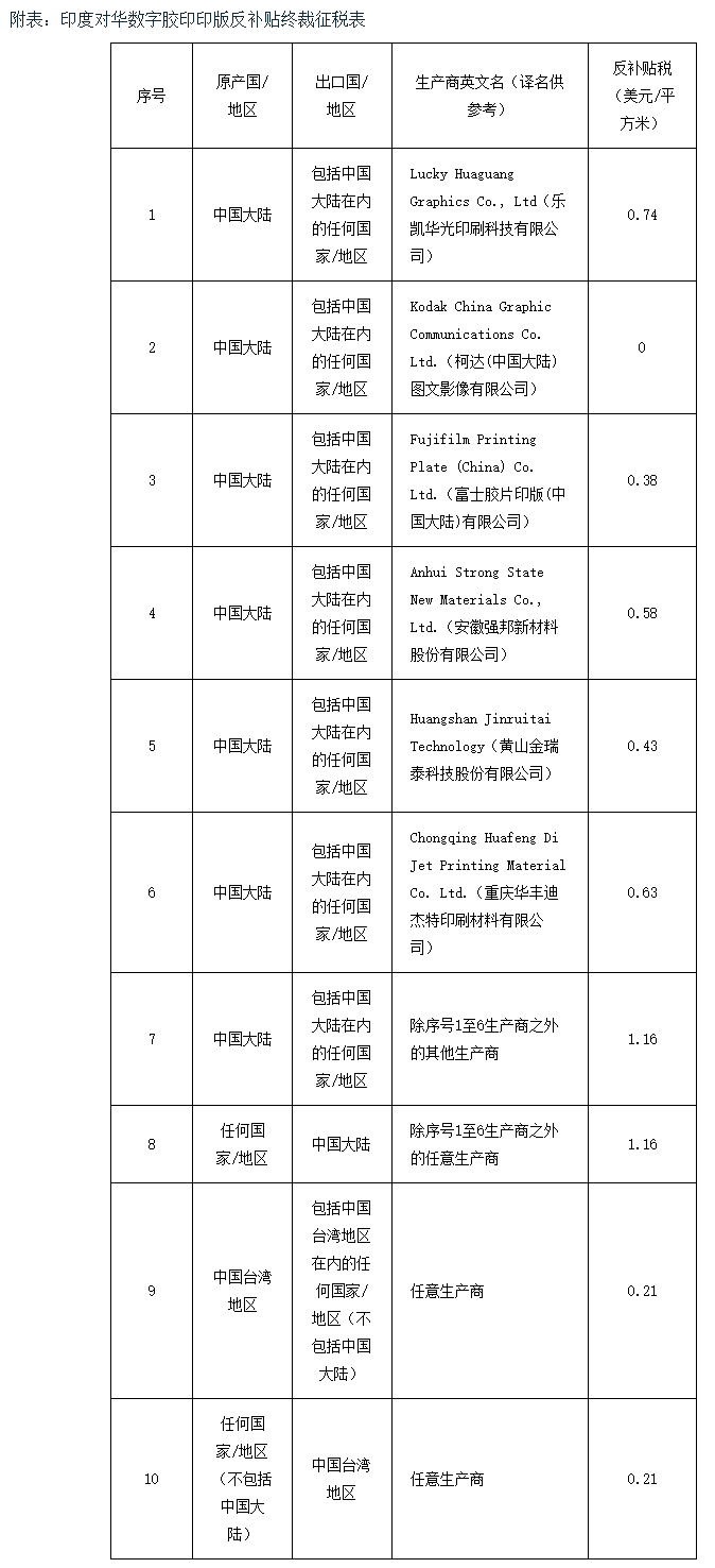 6月27日,印度财政部税收局发布通报称,接受印度商工部于2025年3月28日对原产于或进口自中国大陆和中国台湾地区数字胶印印版作出的反补贴终裁建议以及2025年6月12日和2025年6月26日作出的反补贴终裁修改建议,决定自通报发布于官方公报之日起征收为期5年的反补贴税。
