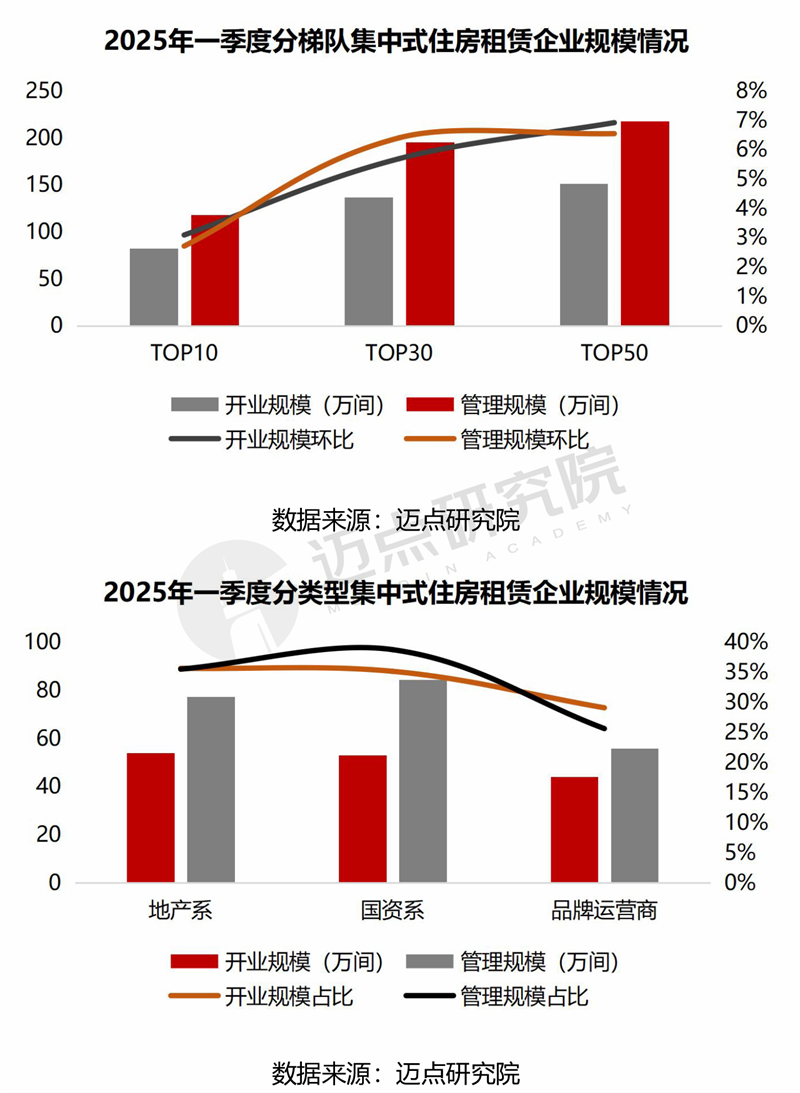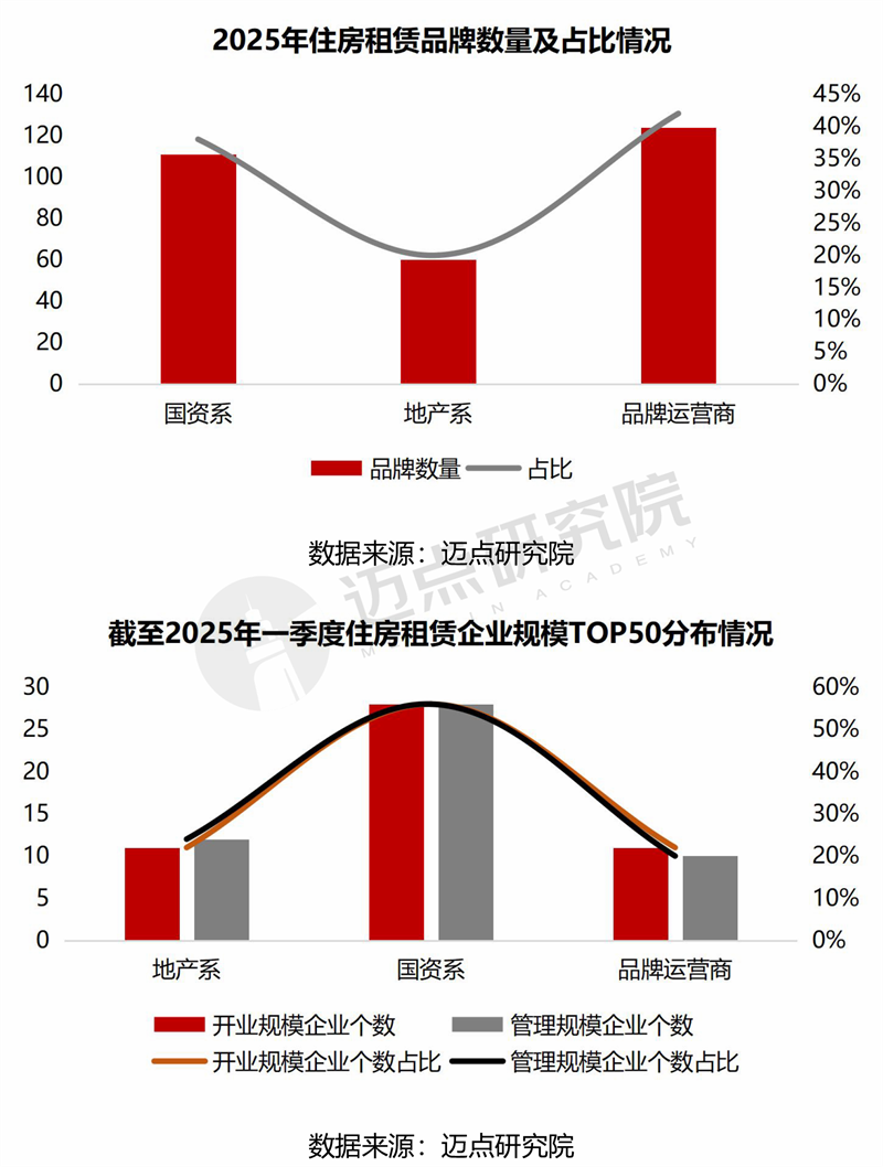 品牌数量情况:国资系品牌加速住房租赁布局,市场占有率持续提升。从迈点研究院2025年监测品牌数量来看,品牌运营商占比仍最高(42%),但国资系品牌扩张迅速,占比由2019年的14%升至2025年的38%。从开业规模TOP50和管理规模TOP50企业分布来看,国资系品牌占据主力,上榜数量过半。