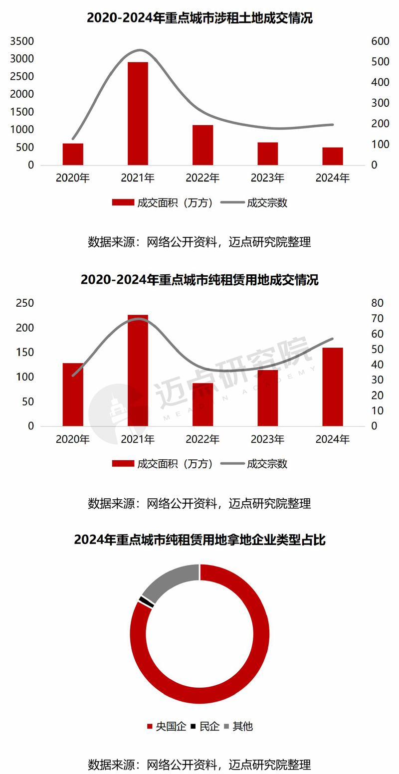 土地供应:涉租用地逐年下降,纯租赁用地有所回升,其中央国企为拿地主力军。涉租土地方面,2021年迎来供应高峰,此后供应量逐年下降,2024年成交196宗,合计用地面积507万方,较2021年下降83%。纯租赁土地方面,2021年同样为高峰期,2022年达到低点,此后成交量缓慢回升,2024年成交57宗,合计面积约160万方,其中83%为国央企拿地。