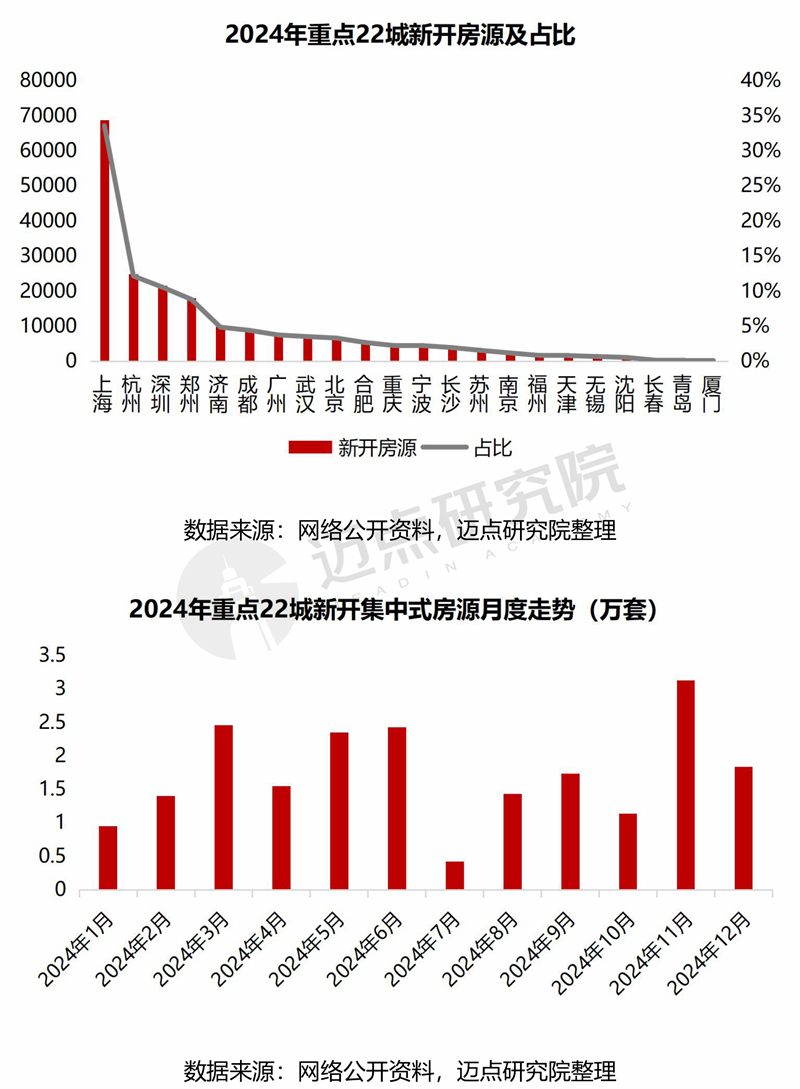 新开情况:2024年新增开业房源超20万套,其中上海领衔。据公开数据显示,2024年全年重点22城新开集中式公寓项目431个,合计房源数超20万套,其中新开保租房项目256个,房源数16.3万套,占比约79.5%。从月度走势来看,3-6月及11月为开业高峰期;3月春节后复工衔接5-6月的毕业季,租赁市场需求旺盛。新项目集中入市抢占市场份额;而基于企业年度布局目标等因素考虑,11月入市规模全年领先。