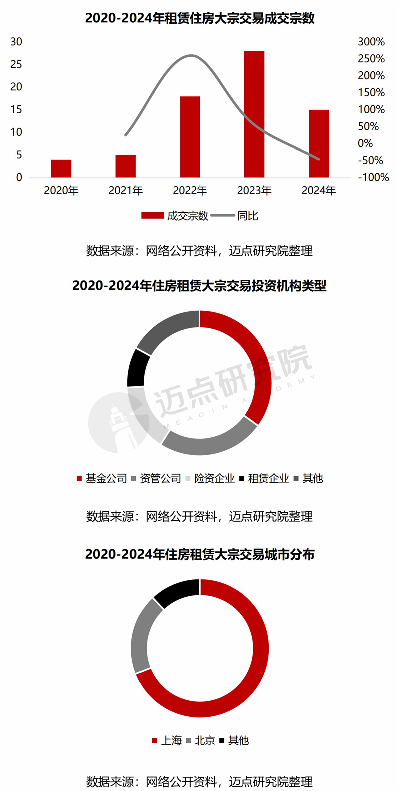 大宗交易:2024年成交明显回落,投资主体多元化。继2023年交易高峰后,住房租赁大宗交易回调,2024年交易约15笔,主要受保租房大规模入市及居民收入降低等因素影响,租金和出租率下降,公寓类资产的收益率也下降。投资类型上,整体表现多元化,其中以建信住房租赁基金为代表的私募基金占38%;此外,以铁狮门、凯德置地为代表的资管企业占比24%。从成交的城市来看,上海以绝对优势领跑市场,成交宗数占比高达69%,其次是北京,占比19%,其余地区合计占比12%。