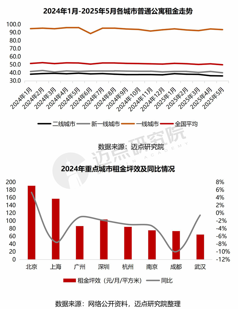 租金情况:整体走势下滑,保租房对租金坪效压制效应显著。整体走势上,全国各城市普通公寓租金呈下滑态势,其中一线城市韧性稍强,2025年5月租金同比下滑2.7%,新一线、二线城市降幅分别为3.99%、8.54%。从城市来看,保租房集中入市带动多城租金坪效下滑,成都、上海降幅分别达10%、7%,仅北京上涨5.4%,城市间分化加剧。