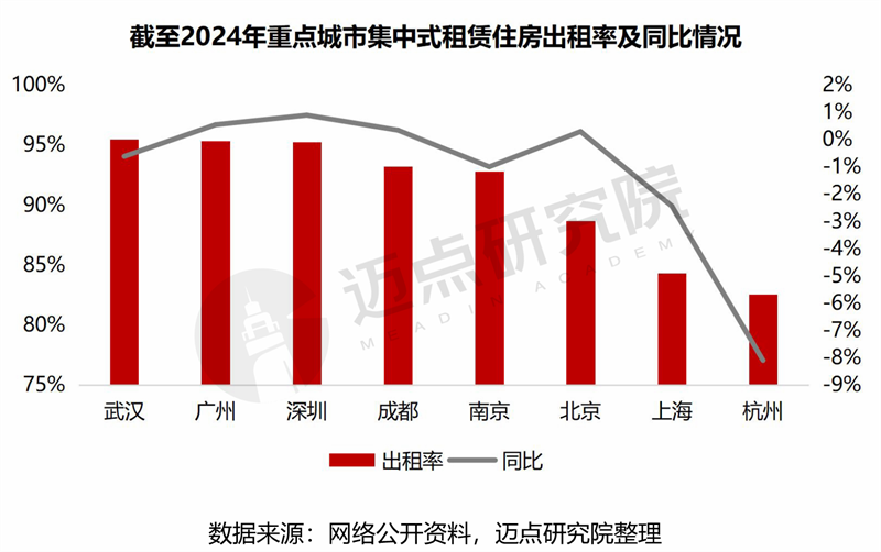 出租率情况:维持稳定,全国平均出租率约91%。全国8个重点城市出租率整体呈现出稳定的特点,约91%的水平,但杭州2024年底出租率下滑明显(-8.1%),出租率降至82.53%。从绝对值来看,武汉、广州、深圳、成都、南京出租率位于92%以上,北京、上海、杭州出租率在90%以下。从同比来看,广州、深圳、成都、北京出租率小幅上涨,其余城市下降。