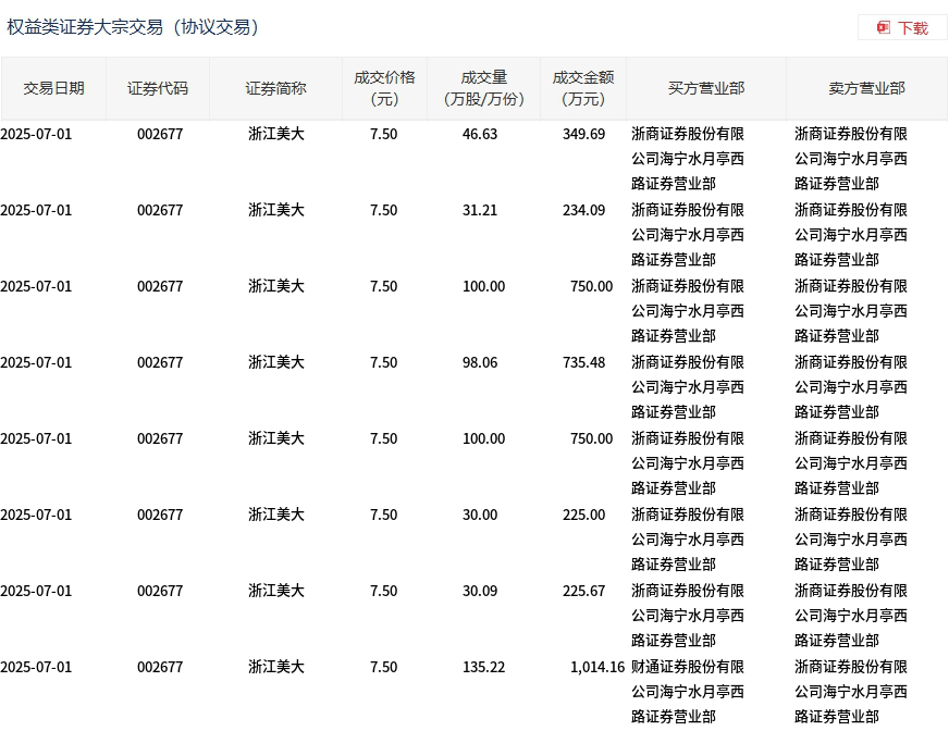 7月1日,浙江美大大宗交易成交571.21万股,成交额4284.09万元,占当日总成交额的68.91%,成交价7.5元,较市场收盘价6.93元溢价8.23%。