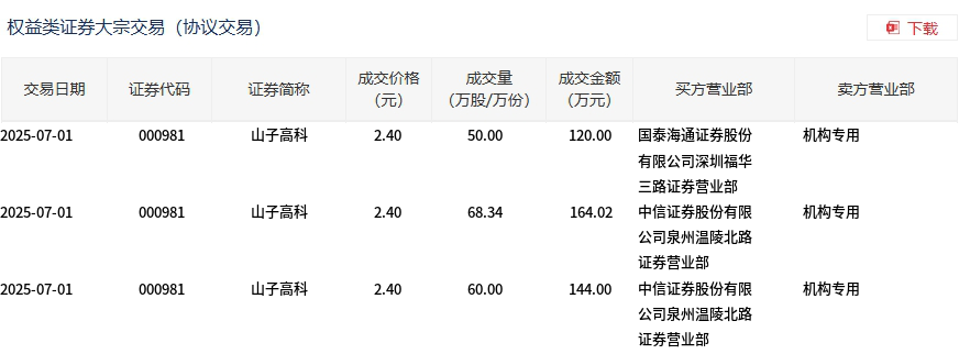 7月1日,山子高科大宗交易成交178.34万股,成交额428.02万元,占当日总成交额的0.21%,成交价2.4元,较市场收盘价2.4元持平。