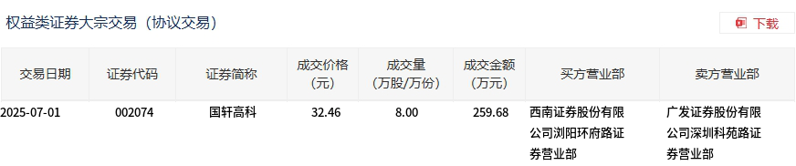 7月1日,国轩高科大宗交易成交8万股,成交额259.68万元,占当日总成交额的0.06%,成交价32.46元,较市场收盘价31.73元溢价2.3%。