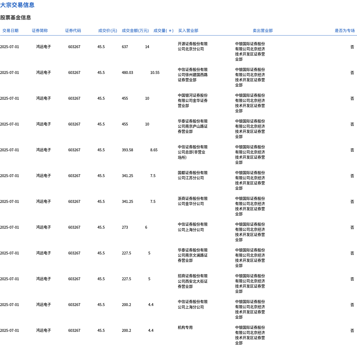 7月1日,鸿远电子大宗交易成交93万股,成交额4231.51万元,占当日总成交额的10.14%,成交价45.5元,较市场收盘价50.37元折价9.67%。