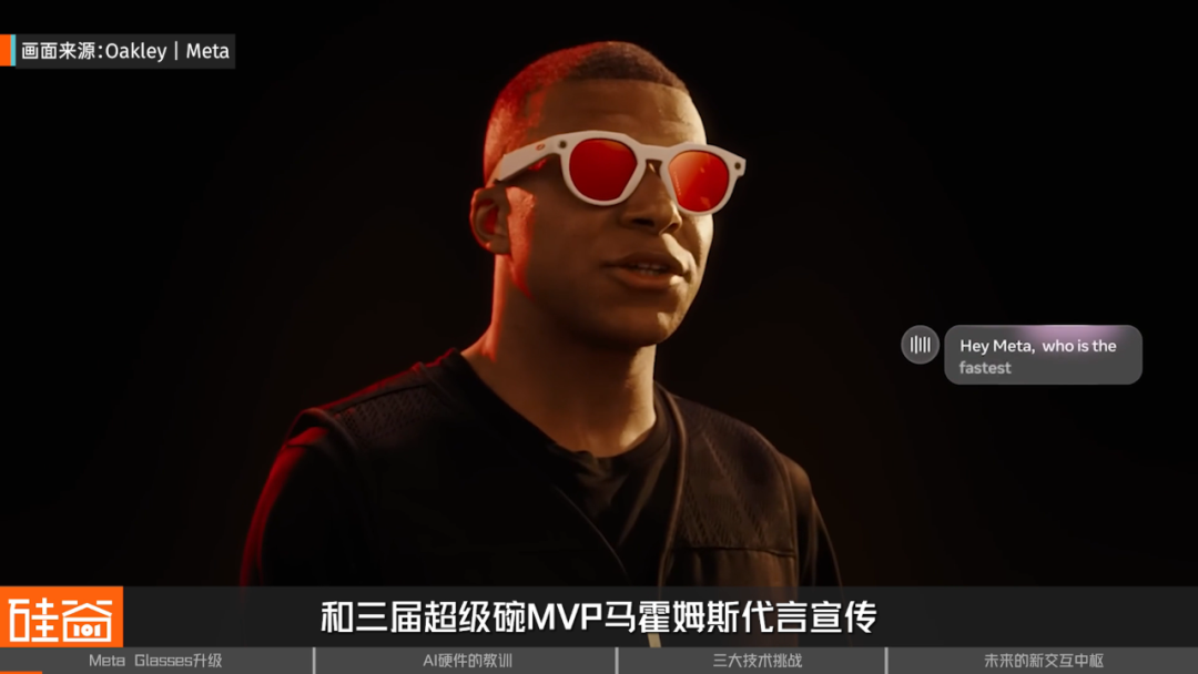 最近,Meta发布了与Oakley合作的AI眼镜Oakley Meta glasses,并且花“钞能力”请来世界杯冠军姆巴佩和三届超级碗MVP马霍姆斯代言宣传。
