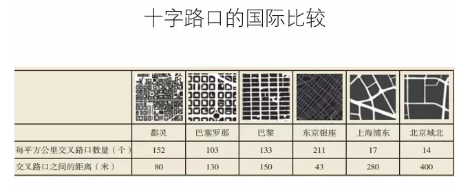 人多就一定会带来交通拥堵吗?把马路拓宽就不堵车了吗?我们可以比较一下几个城市每平方公里十字路口的数量。中国的城市道路没有“毛细血管”,遇上堵车也没办法改换路线。反之,像都灵、巴塞罗那、巴黎、东京这样的密集的道路就能疏散交通。