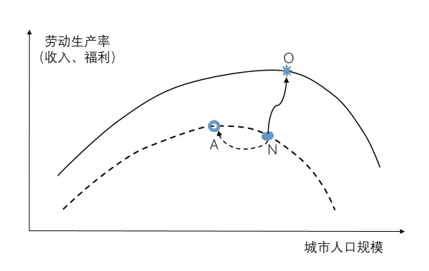 要解决这些问题,要从供给端入手,让市场在资源配置中起决定性力量。当有市场需求的时候,就增加供给和政府投入。从最优城市规模的曲线也可以看出,通过供给侧改革增加供给,从图中的点N到点O可以实现更有效且和谐的城市规模。