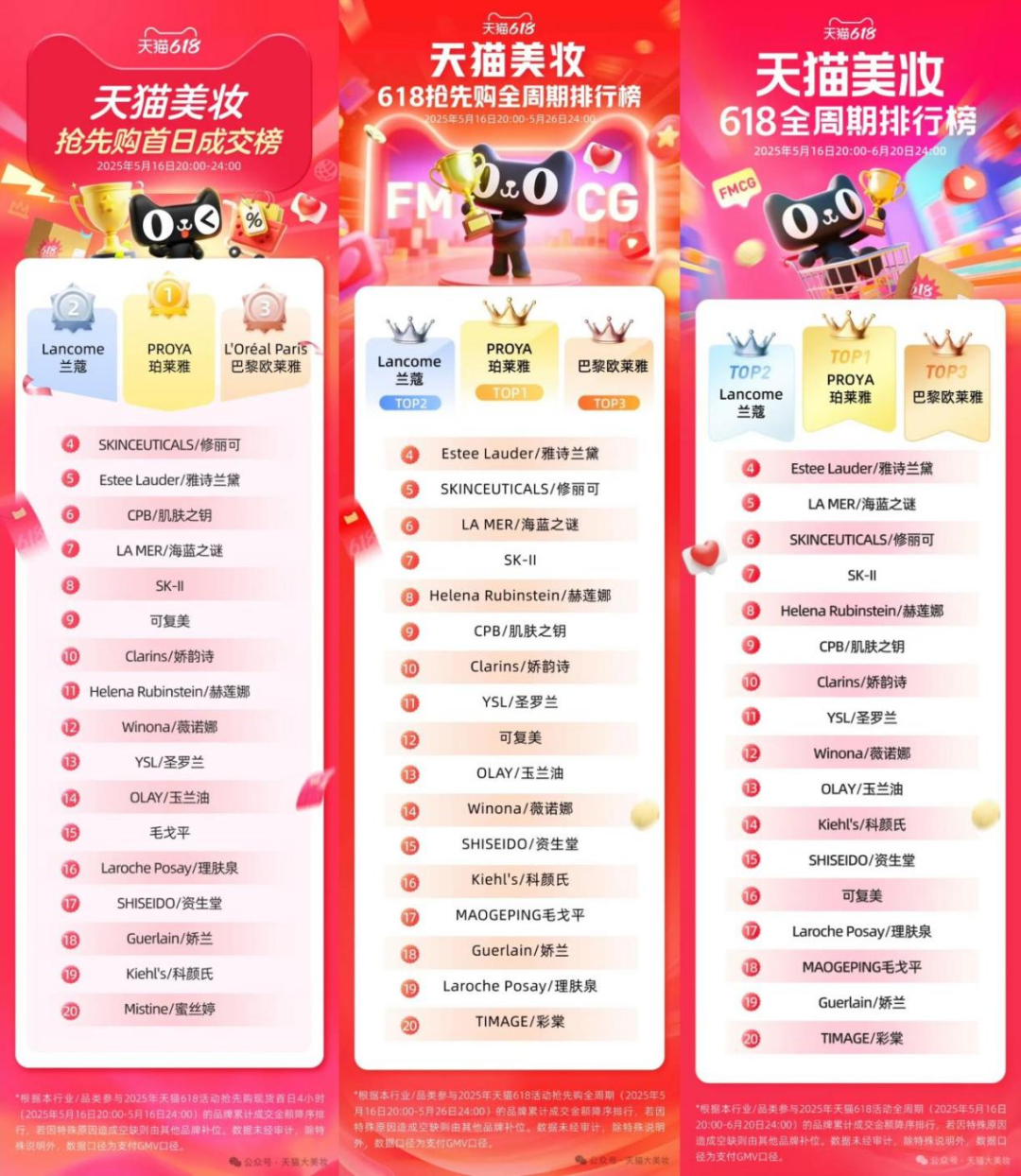 最突出的赢家无疑是珀莱雅。从5月16日晚8点开启的首日榜单,到5月26日结束的抢先购周期,再到6月20日收官的全周期排名,珀莱雅连续三次夺冠。