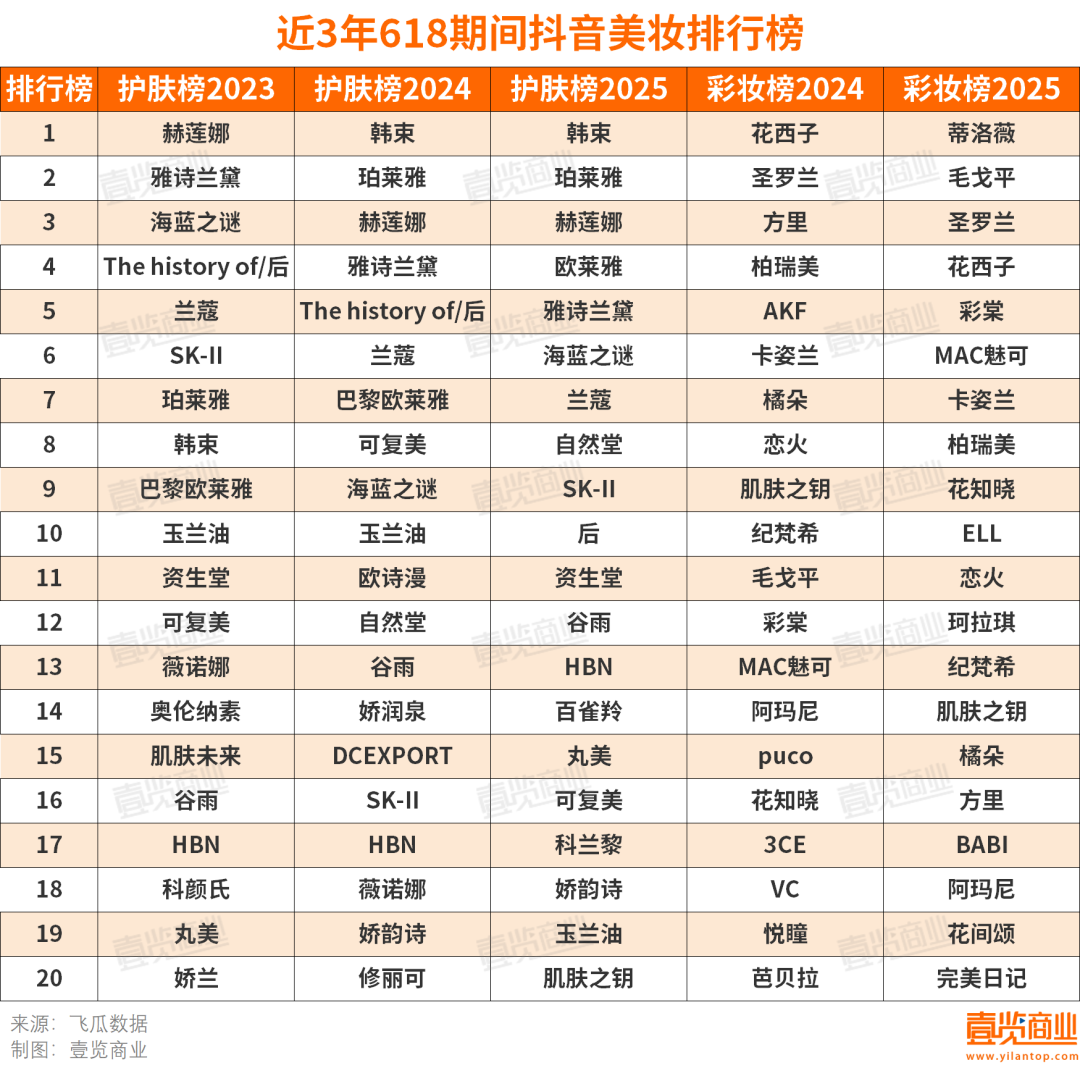 从2023年到2025年,抖音护肤榜与彩妆榜的头部格局持续剧烈变化。