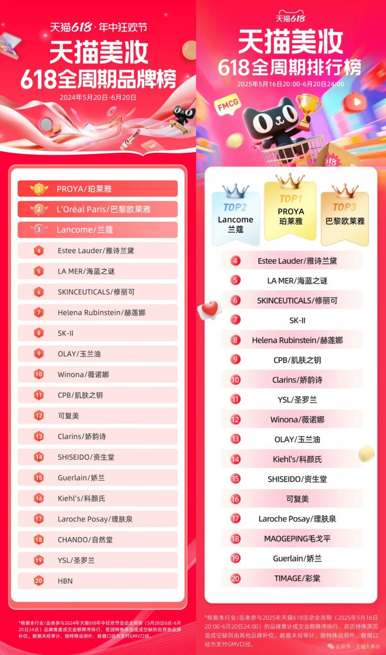 从榜单第10名以后观察,两个年份中品牌更替明显,可复美、薇诺娜等功效型国货略有下滑,表现出功效护肤细分赛道竞争正在加剧;YSL圣罗兰由第19升至第11,表现亮眼,反映出其底妆和彩妆线在平台上的联动策略开始释放潜力;