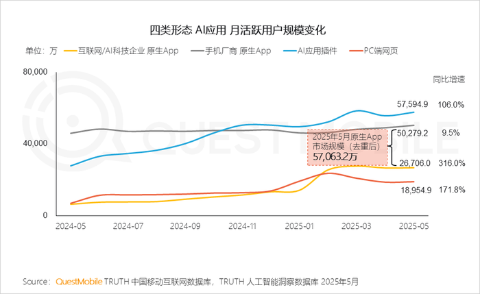 QuestMobile数据显示,过去几个月里,在大模型能力没有出现“代际跃迁”的情况下,AI应用持续深入垂直探索,截止到5月份,插件形态AI应用(In-App AI)、手机厂商原生AI类APP、互联网/AI科技企业原生APP、PC端网页AI应用月度活跃用户规模分别为5.8亿、5亿、2.7亿、1.9亿,同比增速分别为106.0%、9.5%、316.0%、171.8%;如果单从APP角度来看,DeepSeek、华为小艺、OPPO小布助手、豆包、小米超级小爱位居前五位,月活跃用户规模分别为1.69亿、1.59亿、1.56亿、1.31亿、0.83亿。