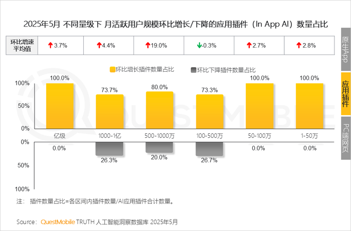 6、插件形态的AI应用,本身自带主App规模效应,因此,绝大部分AI插件都处于流量上升期
