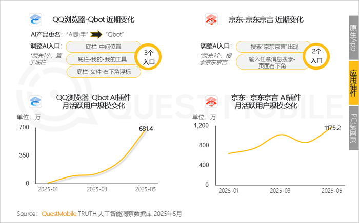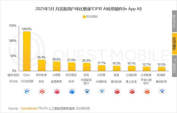 7、部分插件的流量增长来自其入口的调整(位置变化/入口数量增加),如QQ浏览器-Qbot,京东-京东京言此外,3家银行的AI应用也跻身Top10,可见银行业也在加速AI化转型进度。