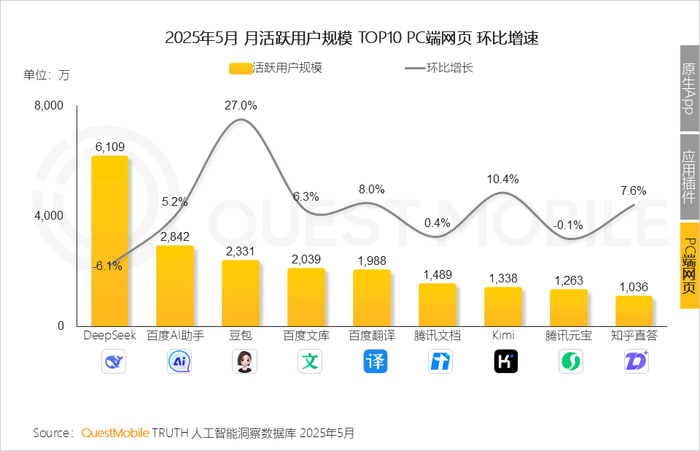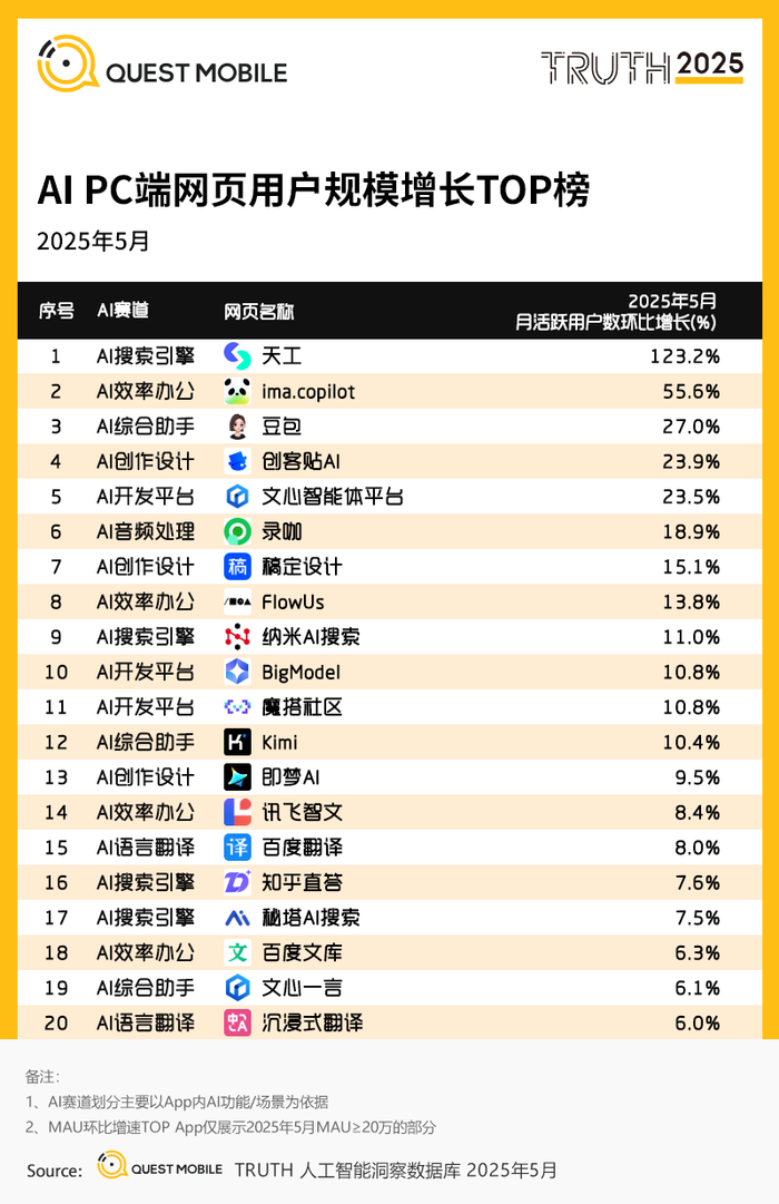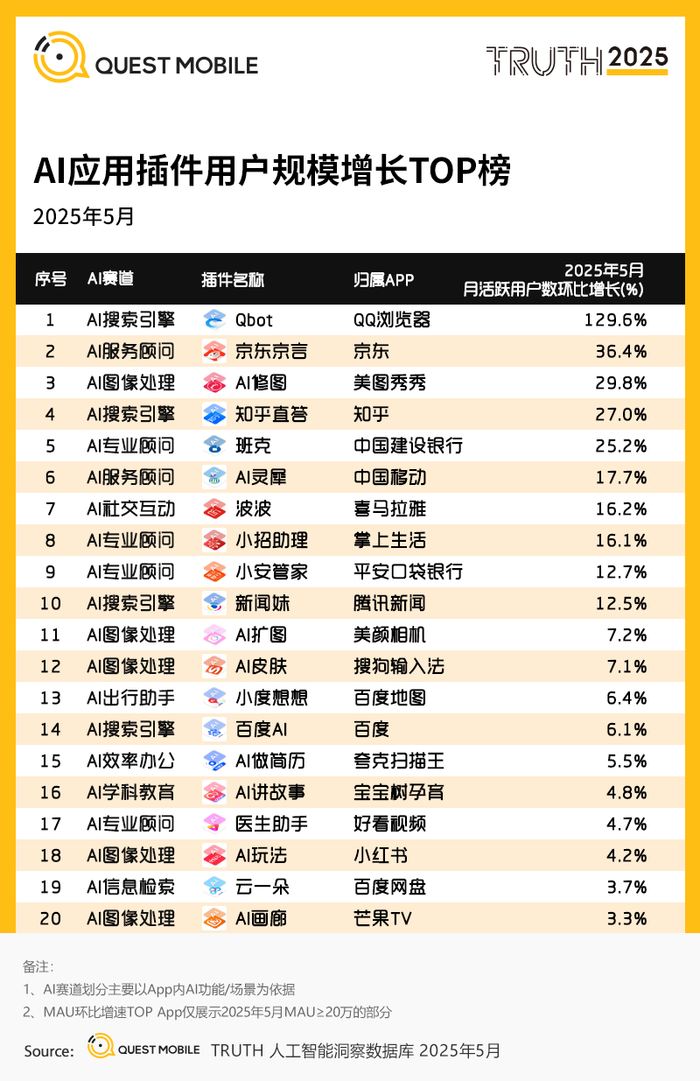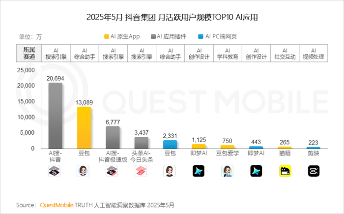 QuestMobile数据显示,2025年5月,AI搜-抖音(插件)以2.07亿月活居首,豆包(原生App)以1.31亿位列第二。
