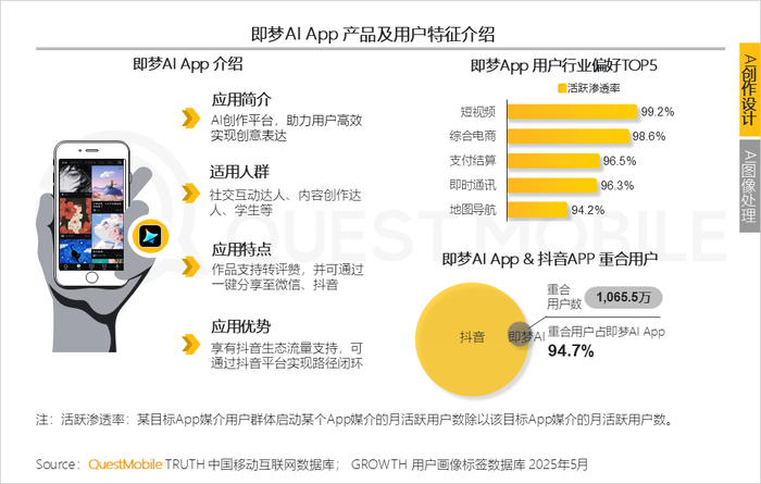 QuestMobile数据显示,即梦AI App对短视频行业的活跃渗透率高达99.2%,也印证即梦AI App用户兼具内容创作与社交互动的双端需求。