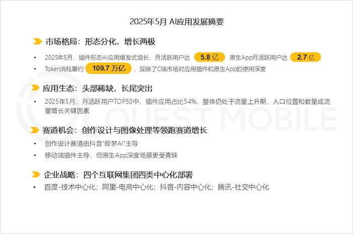 这种格局变化,显示出三大核心趋势:首先,在开源大模型的影响下,插件形态的AI应用已经成为嵌入各类场景的核心模式,并凭借主APP的用户规模和使用习惯,迅速获得用户认可(5月份月人均使用次数达到34.7次,有效Token消耗量高达34.2万亿),形成了一套低成本、广应用、快筛选的“产业基础设施+多元多维生态应用”的发展模式,一如当年4G的迅速普及催生出了百花齐放的移动互联网生态体系,接下来显然会进一步推进各行各业持续升级,给现有的诸多商业模式带来“次世代竞争”雏形。
