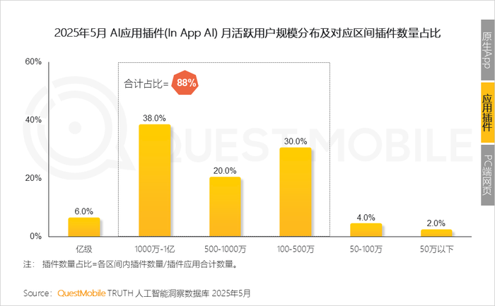 5、传统App在AI转型/升级发展上,呈“哑铃型”结构:100万-1000万规模插件占比达88%;与原生App一致,头部亿级应用存在孵化挑战