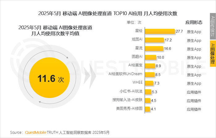 5、从使用次数来看,原生App较插件应用更受用户青睐,背后逻辑与用户对功能的追求一致:原生App具备更完整、更深度的使用场景QuestMobile数据显示,2025年5月,移动端图像处理赛道月人均使用次数为11.6次,星绘、炫图AI、星流均超出平均水平,使用次数分别为27.7次、17.2次和16.6次。