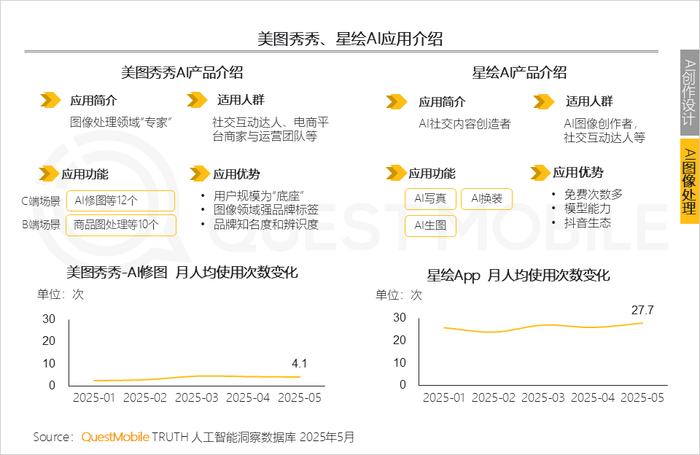6、作为AI图像处理赛道的两个头部应用,美图秀秀的AI场景强调“工具专业化+场景全覆盖”,抖音旗下星绘则以“生成-分发-传播”形成闭环,属于流程重构典型代表