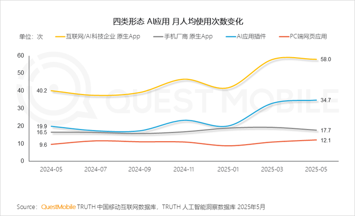 2、活跃度上,具备功能深度集成的原生App(互联网/AI科技企业)及轻量化、场景嵌入优势的应用插件正逐步影响用户心智QuestMobile数据显示,2025年5月互联网/AI科技企业原生App人均使用次数最高达58.0次,剩下依次是AI应用插件(In-App AI),手机厂商原生App,PC端网页应用。