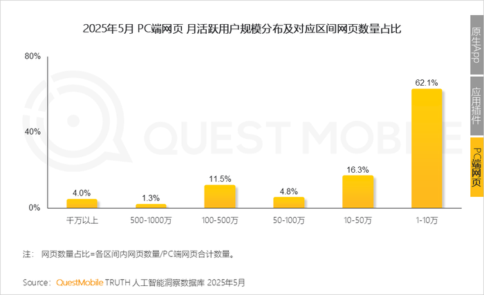 9、PC端网页发展与原生App相似,呈金字塔结构:近八成应用规模停留在50万以下;AI对网站价值的释放,还需找到企业服务场景突破规模瓶颈