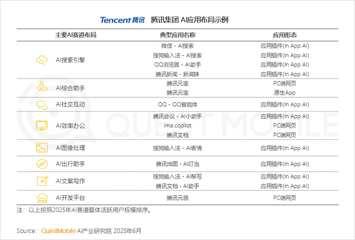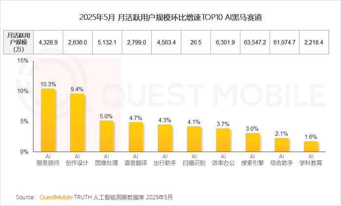 QuestMobile数据显示,AI服务顾问赛道主要由京东-京东京言带动(36.4%);AI创作设计赛道,由即梦AI带动(30.4%);美图秀秀-AI修图与搜狗输入法-AI皮肤则共同推动了AI图像处理赛道的增长。