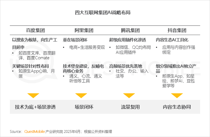 2、四大互联网集团在AI布局上各有侧重,百度技术中心化,阿里电商中心化,抖音内容中心化,腾讯社交中心化;其中腾讯和抖音更聚焦重塑泛生活及娱乐体验