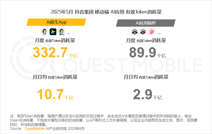 4、2025年5月,抖音集团移动端AI应用Token消耗量过40万亿,原生App的消耗是插件(In App AI) 的3.7倍