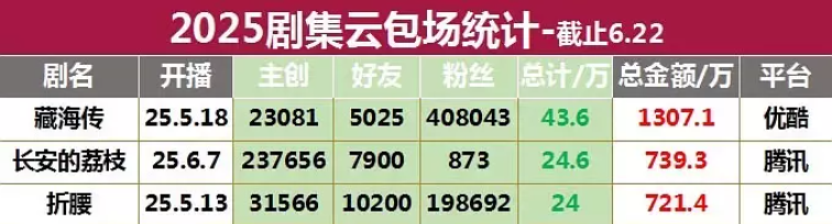 据豆瓣小组“收视率研究中心”统计的数据显示,截止6月22日,超高的云包场名单中不乏爆款的身影,比如,《藏海传》《折腰》《大奉打更人》《临江仙》。其中,《藏海传》的云包场投入1307.1万,成为首个千万级云包场剧集,粉丝奉献居多,而排在第二位的《长安的荔枝》,云包场投入739.3万,主创贡献居多。