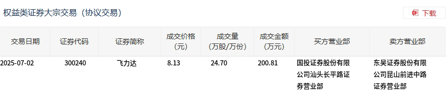 7月2日,飞力达大宗交易成交24.7万股,成交额200.81万元,占当日总成交额的0.27%,成交价8.13元,较市场收盘价9.48元折价14.24%。