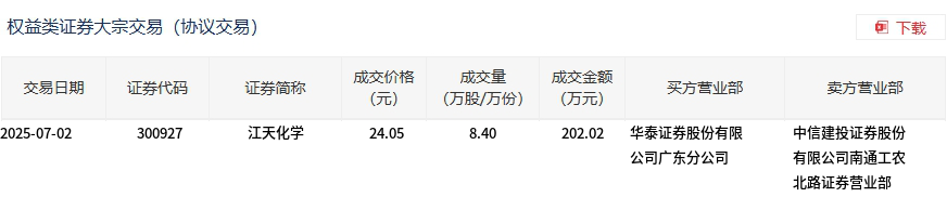 7月2日,江天化学大宗交易成交8.4万股,成交额202.02万元,占当日总成交额的1.42%,成交价24.05元,较市场收盘价28.29元折价14.99%。
