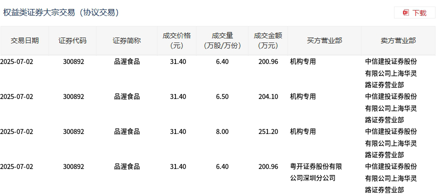 7月2日,品渥食品大宗交易成交27.3万股,成交额857.22万元,占当日总成交额的3.87%,成交价31.4元,较市场收盘价35.18元折价10.74%。