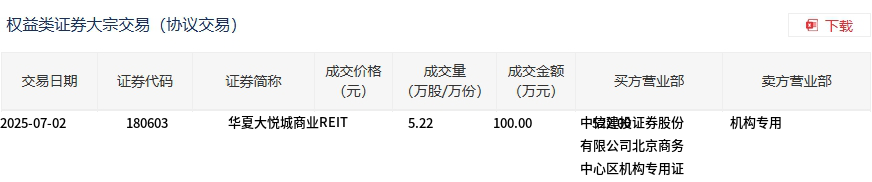 7月2日,华夏大悦城商业REIT大宗交易成交100万股,成交额522万元,占当日总成交额的41.53%,成交价5.22元,较市场收盘价5.239元折价0.36%。