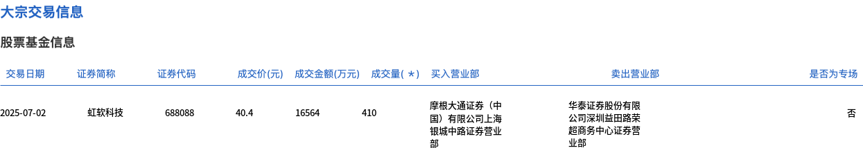 7月2日,虹软科技大宗交易成交410万股,成交额1.66亿元,占当日总成交额的49.44%,成交价40.4元,较市场收盘价47.29元折价14.57%。