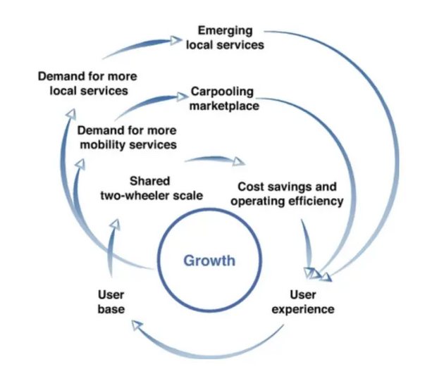 但哈啰的飞轮,却走了岔路。与美团一头连接消费者、一头连接海量商家的模式不同,哈啰共享单车飞轮的另一头,连接的却是哈啰自己。