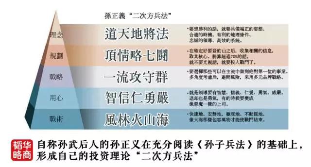 后来,孙正义还把对《孙子兵法》的理解梳理成了“二次方兵法”:道天地将法,顶情略七斗,一流攻守群,智信仁勇严,风林火山海,从领导理念到愿景、战略、领导心得、战术,无一不包。