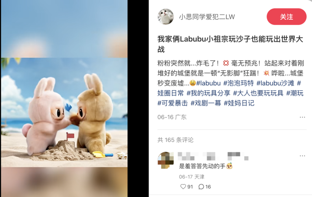 娃爸、娃妈们脑补出了LABUBU的日常,创造出了LABUBU在沙滩上“世界大战”的AI视频,像极了自家小孩在沙滩上嬉戏打闹的场景。“是羞答答先动的手”,有网友在评论区调侃道。