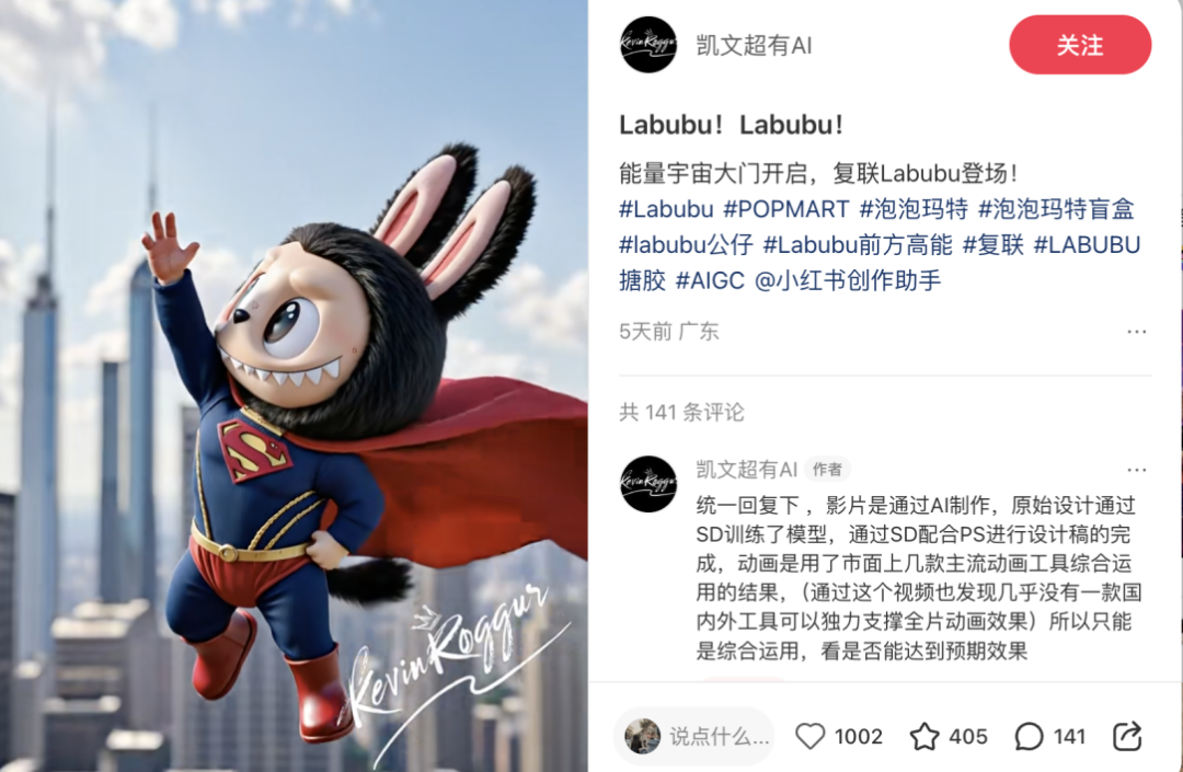 与传统迪士尼IP不同,LABUBU的官方IP的故事线设定十分模糊,这种叙事留白成为了引发用户集体创作的核心驱动力,AI工具提升了用户对LABUBU人格的共创效率。