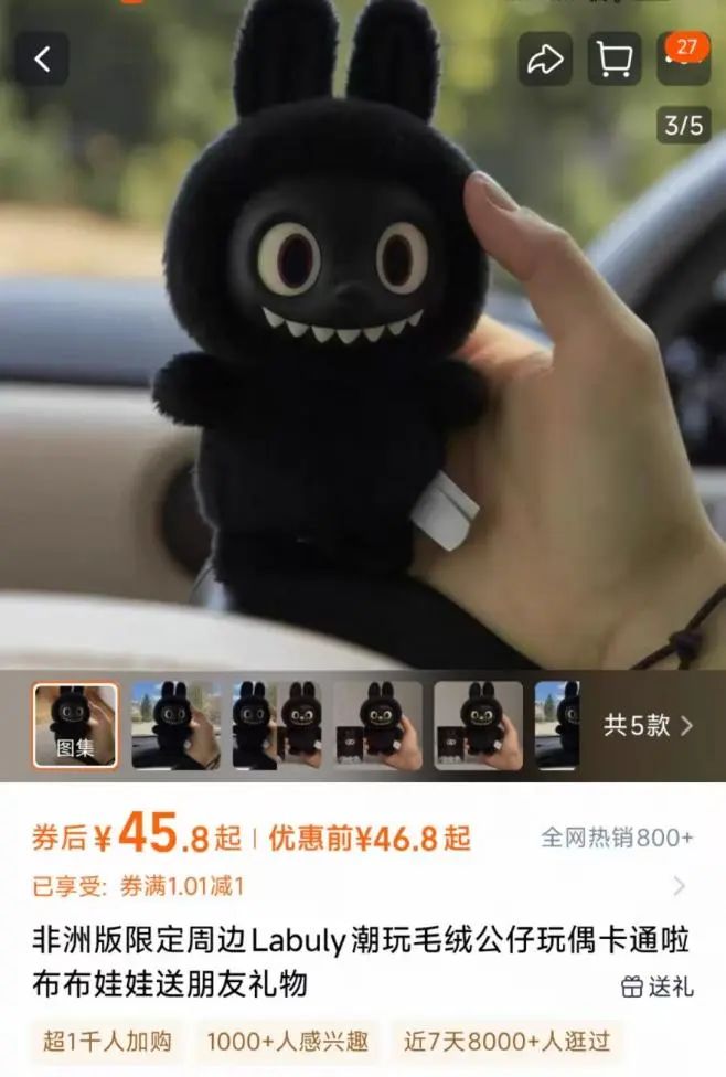经AI设计的特别版LABUBU有一些已经被生产成毛绒公仔兜售,在电商平台上,非洲版限定周边的“黑人版LABUBU”售价45.8元,引发超千人加购,全网热销已达800+。