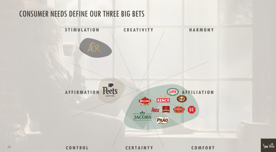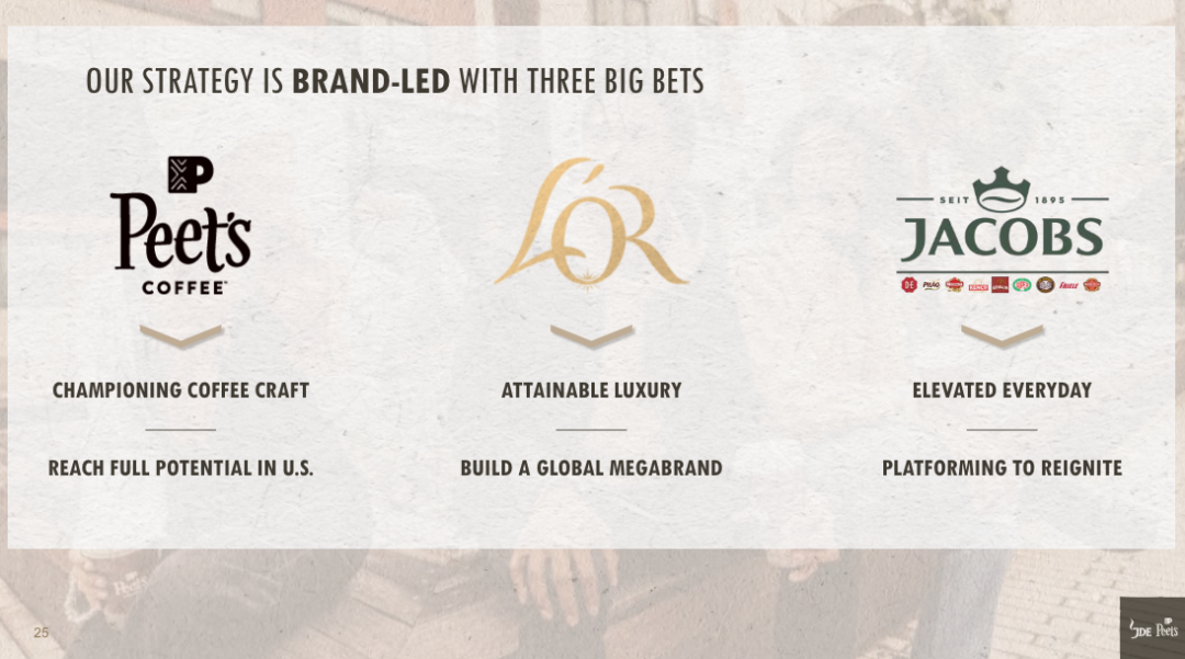 Oliveira在上述资本市场日上表示,战略以品牌为主导,围绕Peet’s(皮爷咖啡)、L’OR 和Jacobs这三大核心品牌,以及由它们所领衔的十大标志性品牌。
