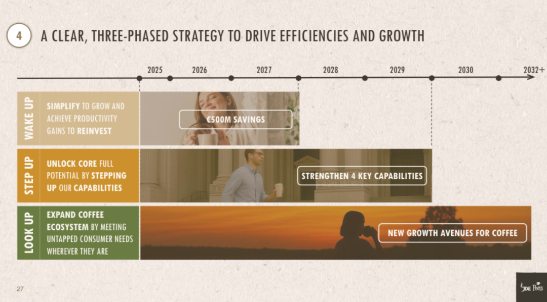 同时,JDE Peet’s还明确了一系列规划,包括:简化投资组合与组织模型;提高运营效率和生产力;实现5亿欧元净成本的节约(折合人民币约42亿元),且超过一半的节约额在2027年底前完成;计划将节约成本的50%投入到具有高潜力的增长项目及关键能力提升上,其余50%用于增强盈利能力;同时,通过新的增长途径扩大公司的全球影响力。