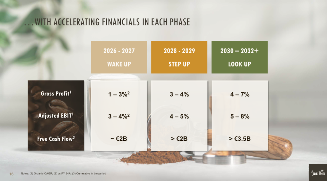 JDE Peet’s还制定了相应的财务目标,2026-2027年、2028-2029年、2030-2032年毛利率的有机复合年增长率分别为1-3%、3-4%和4-7%,调整后息税前利润分别为3-4%、4-5%和5-8%,自由现金流分别为约20亿欧元、至少20亿欧元和至少35亿欧元。