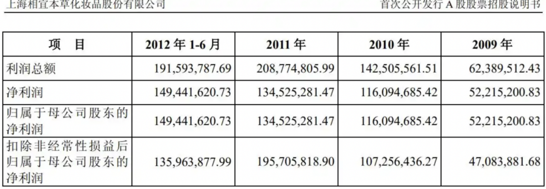 资本加持下,据当时披露招股书及公开资料,2008年相宜本草销售额为2.17亿元,增速超140%,2009-2011年,相宜本草的收入从3.77亿元增至13.35亿元,扣非后净利润从4708.39万元飙升至1.96亿元,2013年销售额达23亿元峰值。