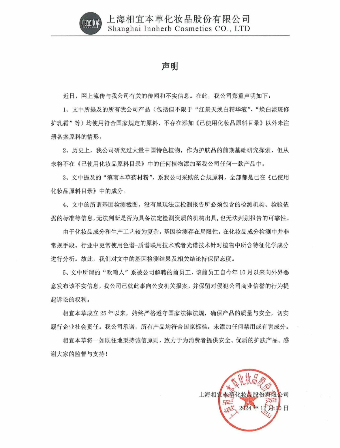 该声明不到2小时被删除,12月20日,相宜本草再次发布《声明》一方面表示文中提及的所有公司产品(包括但不限于“红景天焕白精华液”“焕白淡斑修护乳霜”等)均使用符合国家规定的原料,不存在添加《已使用化妆品原料目录》以外未注册备案原料的情形。